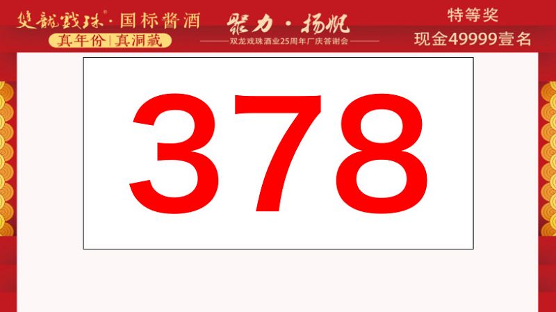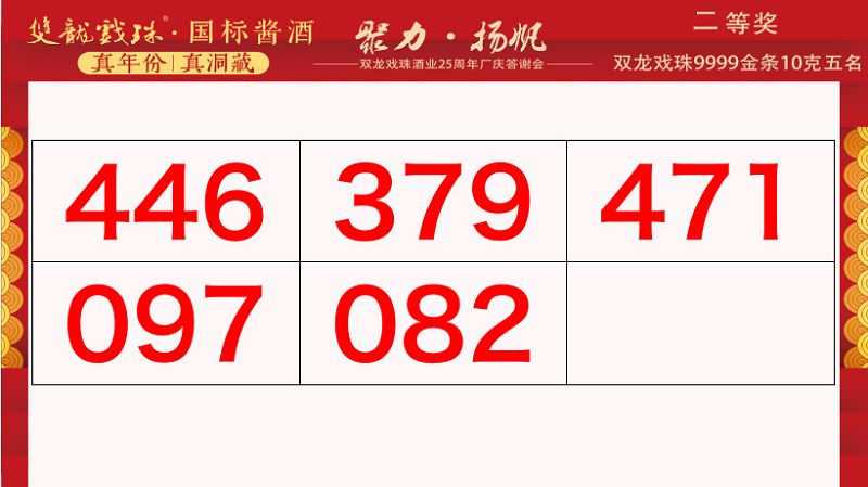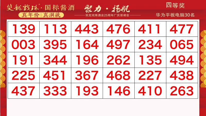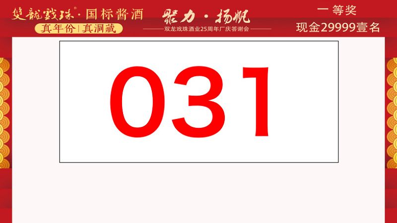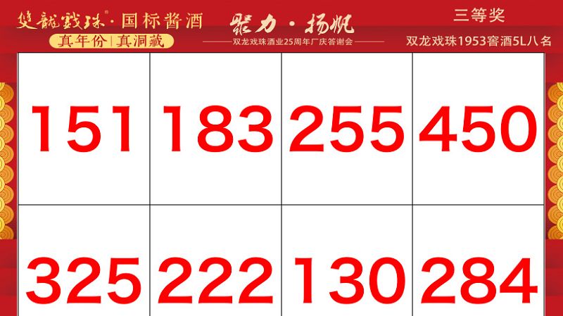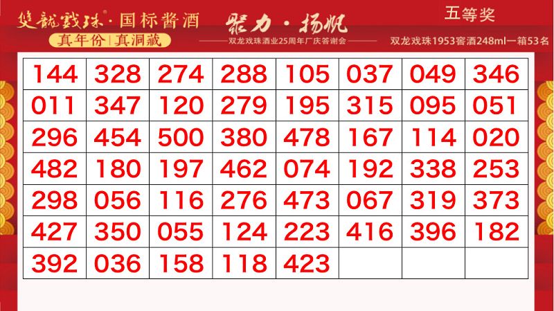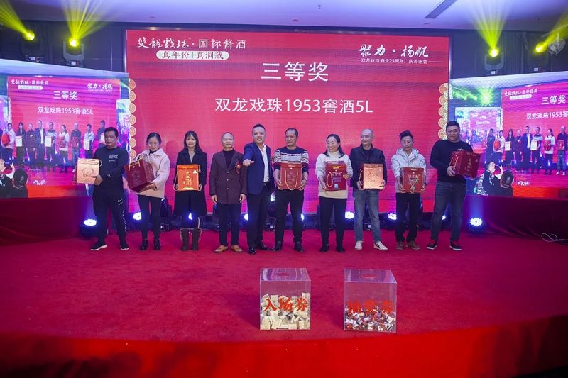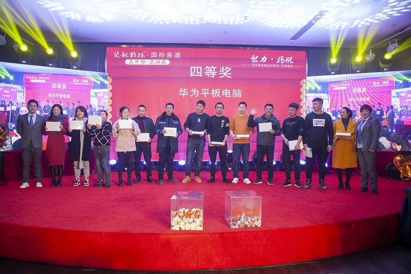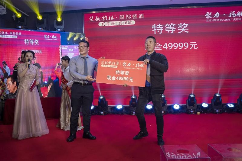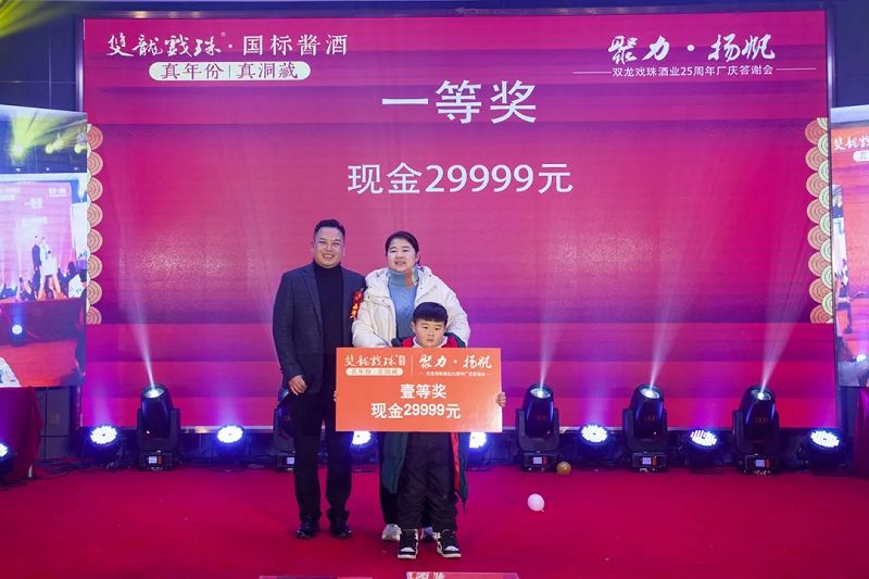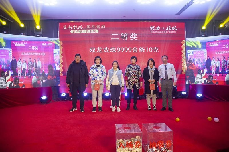 本場答謝宴共誕生特等獎(jiǎng)(49999元現(xiàn)金)得主1位、一等獎(jiǎng)(29999元現(xiàn)金)得主1位、二等獎(jiǎng)(雙龍戲珠9999金條10克)得主5位、三等獎(jiǎng)(5L雙龍戲珠1953洞藏窖酒)得主8位、四等獎(jiǎng)(華為平板電腦壹臺(tái))得主30位、五等獎(jiǎng)(雙龍戲珠1953窖酒248ml壹箱)得主53名。