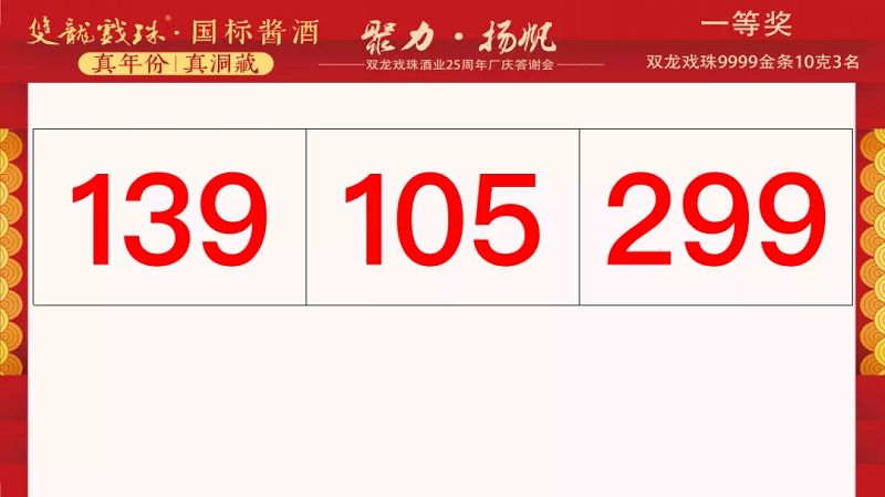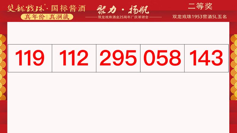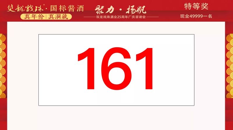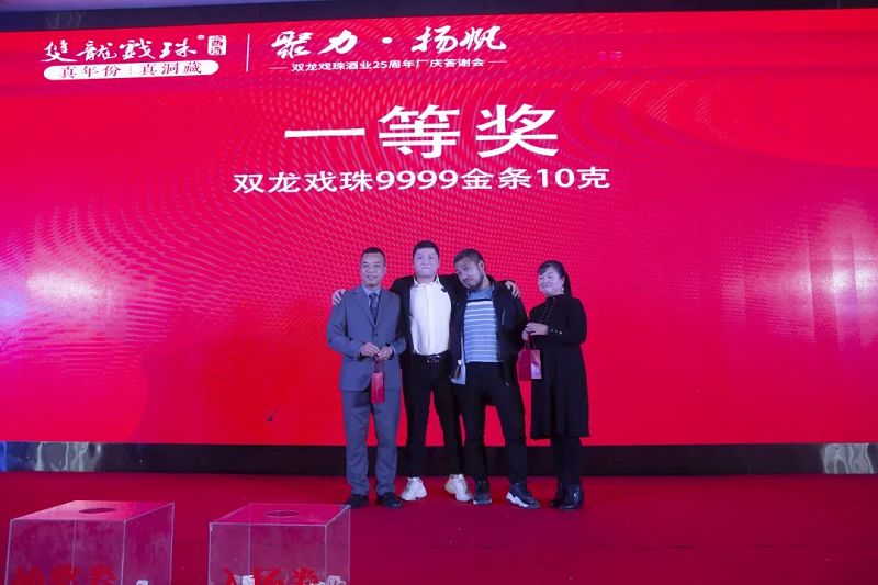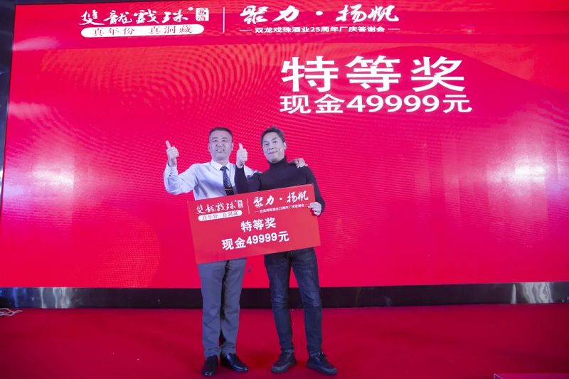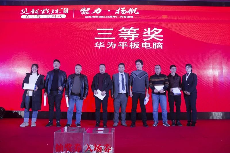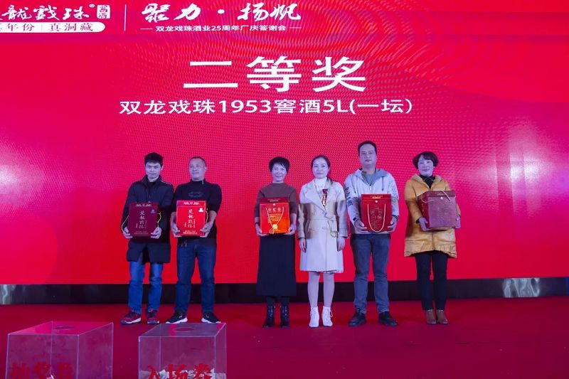 本場(chǎng)答謝宴共誕生特等獎(jiǎng)(49999元現(xiàn)金)得主1位、一等獎(jiǎng)(雙龍戲珠9999金條10克)得主3位、二等獎(jiǎng)(5L雙龍戲珠1953洞藏窖酒)得主5位、三等獎(jiǎng)(華為平板電腦壹臺(tái))得主20位、四等獎(jiǎng)(雙龍戲珠1953窖酒248ml壹箱)得主30名。