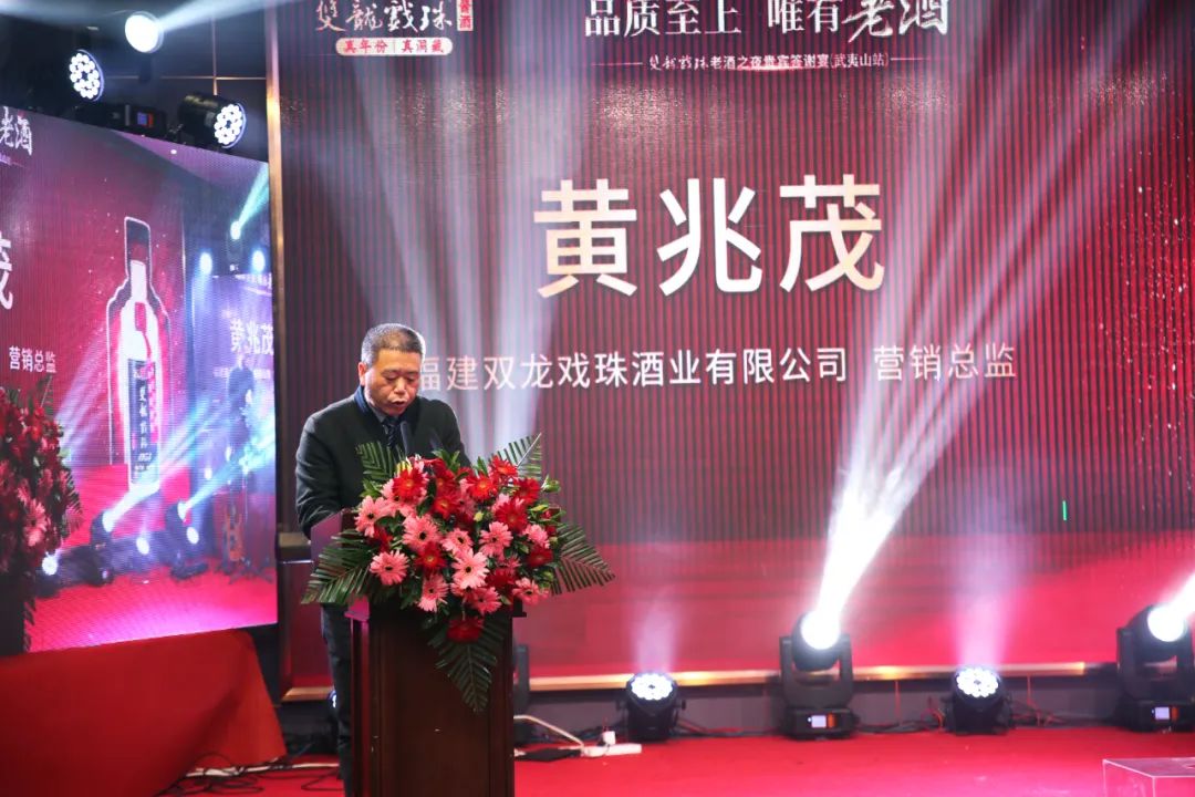 以酒為媒,齊聚一堂!12月1日,以“品質至上 唯有老酒”為主題的雙龍戲珠老酒之夜貴賓答謝宴(武夷山站)在武夷山富貴武夷大酒店隆重舉行。福建雙龍戲珠酒業(yè)有限公司營銷總監(jiān)黃兆茂、武夷山拳擊貓酒水商行總經(jīng)理蔡世華出席活動并致辭。