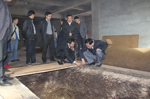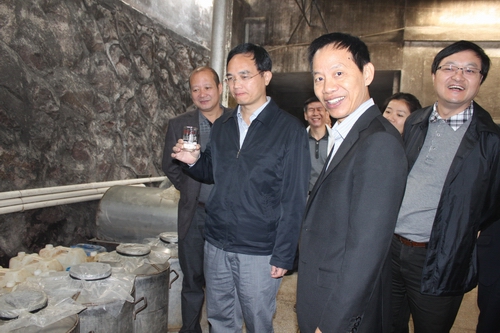 2012年11月6日南平市市長林寶金到公司指導工作,林市長一行參觀了釀造車間,向總經(jīng)理馮敏了解泥窖發(fā)酵工藝特點,參觀了貯酒山洞—雙龍洞、酒文化展示廳。